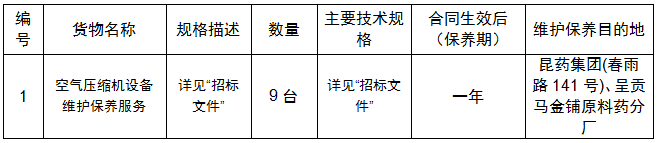 本次招标采购空气压缩机设备维护保养为制造中心在用空气压缩机,投标方应根据议标文件提出的设备技术规格和服务等要求,空气压缩机设备共9台,其中2台位于马金铺(呈贡)原料药分厂,其他设备都位于五华区春雨路141号。